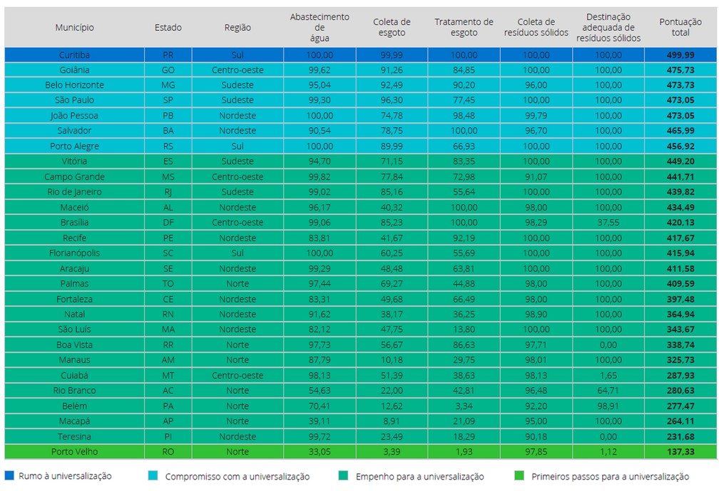 Entre as capitais, a melhor avaliada foi Curitiba, a única que atingiu pontuação suficiente para ser classificada ena categoria “rumo à universalização” (acima de 489 pontos). Na sequência, estão Goiânia, Belo Horizonte, São Paulo, João Pessoa, Salvador e Porto Alegre. A pior avaliada foi Porto Velho, a única enquadrada no patamar mais baixo do ranking: “primeiros passos para a universalização”.